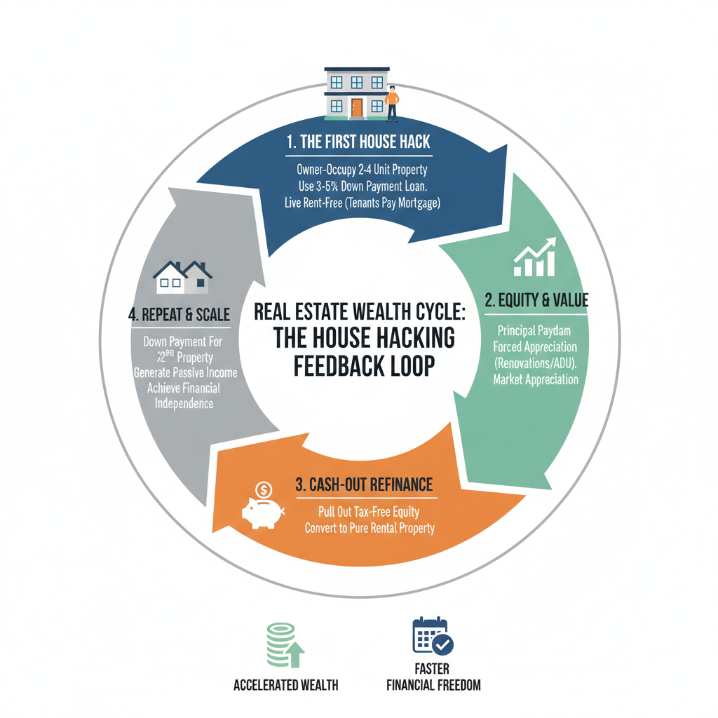 - The Refinance/Second Purchase: After two to three years of paying down the loan and potentially increasing the property value through smart improvements (like an ADU or unit upgrades), you can perform a cash-out refinance. This allows you to pull out tax-free equity (the money your tenants helped you build) to use as the down payment on your second investment property, allowing you to transition your first hack into a purely cash-flowing rental. This process is the core of real estate wealth building. Here’s an illustration of how these cycles contribute to long-term wealth: